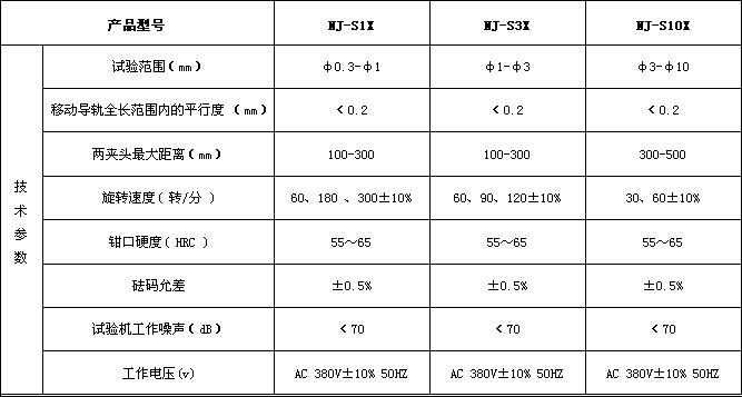 型號(hào):NJ-S1X,NJ-S3X,NJ-S10X一、用途:該扭轉(zhuǎn)試驗(yàn)機(jī)主要用于測(cè)定直徑φ0.3-φ1mm,φ1-φ3mm,φ3-φ10mm金屬線材在單向或雙向扭轉(zhuǎn)中承受塑性變形的能力,試驗(yàn)過(guò)程中可以顯示線材的表面缺陷。主要適用于科研部門(mén)、工礦企業(yè)和大專院校的力學(xué)實(shí)驗(yàn)室用來(lái)測(cè)定材料的扭轉(zhuǎn)性能,特別適合生產(chǎn)線材單位在線檢測(cè)及使用線材單位的進(jìn)貨檢驗(yàn)。二、性能特點(diǎn):l、扭轉(zhuǎn)試驗(yàn)機(jī)有2-3種旋轉(zhuǎn)速度可供選擇,如30、60、90、120、180、300轉(zhuǎn)/分,通過(guò)皮帶塔輪調(diào)整;2、可夾持線材長(zhǎng)度300-100mm、500-300mm;用滑輪導(dǎo)向砝碼加軸向力,液晶顯示試驗(yàn)圈數(shù),試件斷裂后試驗(yàn)圈數(shù)值自動(dòng)鎖存。